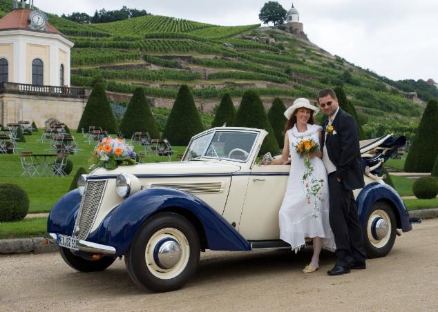 Hochzeit 2005 auf Schloß Wckerbarth, unsere standesgemäße Hochzeitskutsche ist ein Wanderer 6 Zylinder.